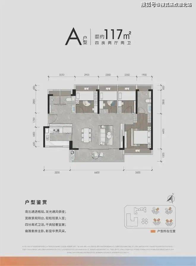 产品:4栋住宅,总户数1448套(可售商品房744套),含89㎡三房、108-117㎡四房,全南向设计,精装交付