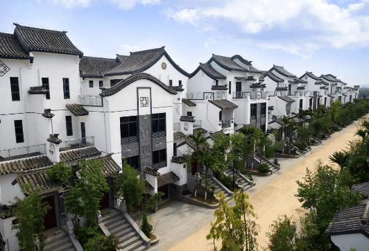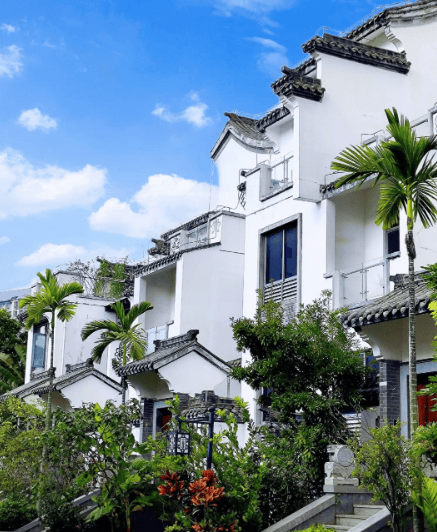 建筑风格:以中式徽派建筑为主,融合现代元素,亭台楼阁、青砖黛瓦彰显传统韵味,兼具现代居住舒适性。