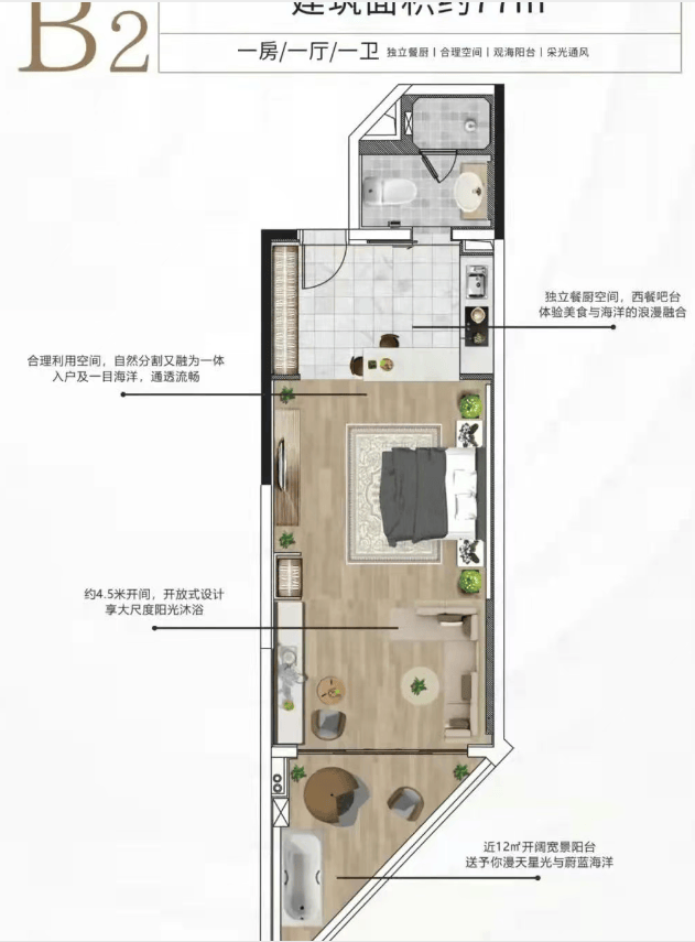 一居室:如 B2 户型约 77 平方米,一房一卫。