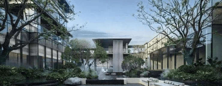 项目以「全球安缦酒店」的隐奢美学为灵感,通过「一环两轴三境」的空间设计,以“三境七颂”为笔触,匠造东方精奢园林。双重立体园林借由约4.3米高的地势抬升次第展开,以城市罕见的约9.4米挑高空间为载体,定制约600㎡琉璃光苑,更引约10米巨幕飞瀑吞吐其中,形成「步移景异」的沉浸式体验:清晨在飞瀑边活动,午后在琉璃光苑的藤椅上阅读,傍晚带孩子在花园里散步……每一步,都是对「诗意生活」的具象化诠释。