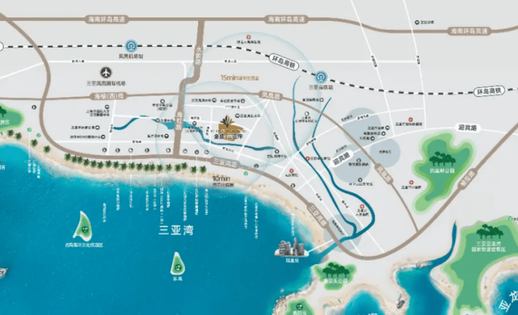 商业教育医疗:3km 内覆盖丽禾 MOHO 广场、海之眼商业综合体、海旅免税城;周边有三亚市第一中学、三亚湾小学;距三亚中心医院、市人民医院等车程约 15 分钟;