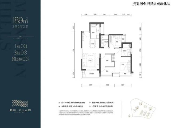 01户型:89㎡的3房2卫,设计的南北通透竖厅格局,客厅3.5米开间,三开间朝南,L型厨房,3个卧室做到了2.9/3.2/3.1米的宽度,阳台主朝西南向。