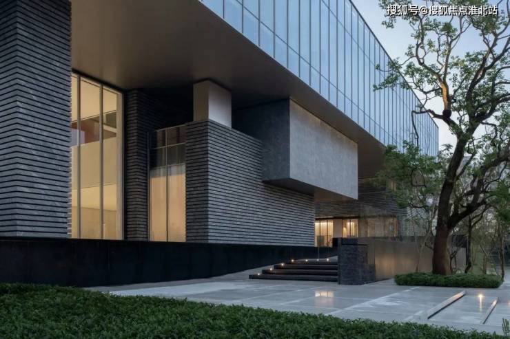 建筑整体采用纯幕墙体系,石材+铝板+玻璃+不锈钢在外墙材质中占比超过百分之九十,整个外立面基本为玻璃+石材的组合,采用创新石材节点体现层叠肌理感,局部银灰雾面不锈钢内框收边,以精装手法处理外立面。