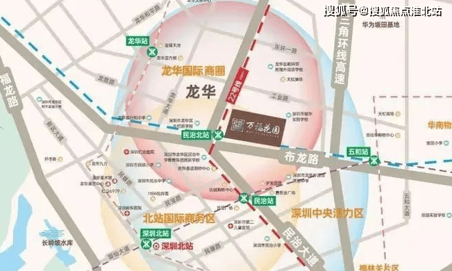 交通配套:紧邻布龙路与民治大道两条主干道,距离在建的地铁 22 号线和 33 号线民治北站仅约 200 米,周边直线 1km 内有 15 个公交站,距离最近的万众城家居广场站仅有 221m。