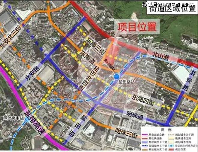 项目位于盐田街道,西临城市次干道盐田北四街,南临城市次干道东海道,北临城市快速路北山道,背靠盐田河。