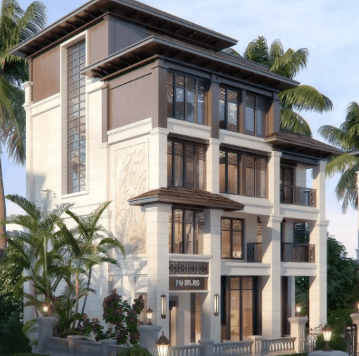 产权70 年住宅,交房时间 2021 年 8 月 31 日(纯现房),总占地规模不大但密度极低,容积率 0.25,绿化率 30%,机动车位 25 个,物业费 4.5 元 /㎡・月。社区共规划15 栋独栋别墅,分两种户型,全部带私家庭院、独立入户门厅与私家车位,外立面新中式风格,搭配大面积玻璃窗,部分户型有 270° 景观阳台、露台与多功能休闲空间: