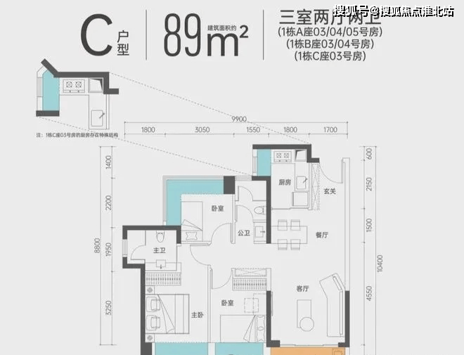 户型-89㎡3房2厅2卫:经典实用格局,比市面同功能的三房面积更小,总价更低。同时三开间朝南,居住舒适度有保障。