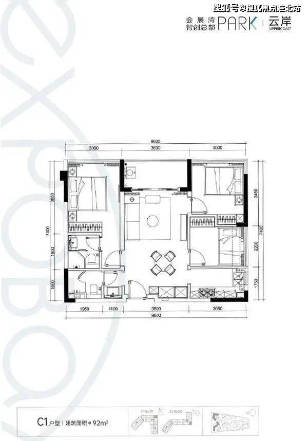 【C1户型:92㎡】房型:三房两厅两卫朝向:T5、T6(正南)户型优势:端头位、双面采光、主客分区、无敌景观 (瞰河)