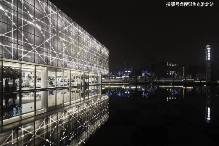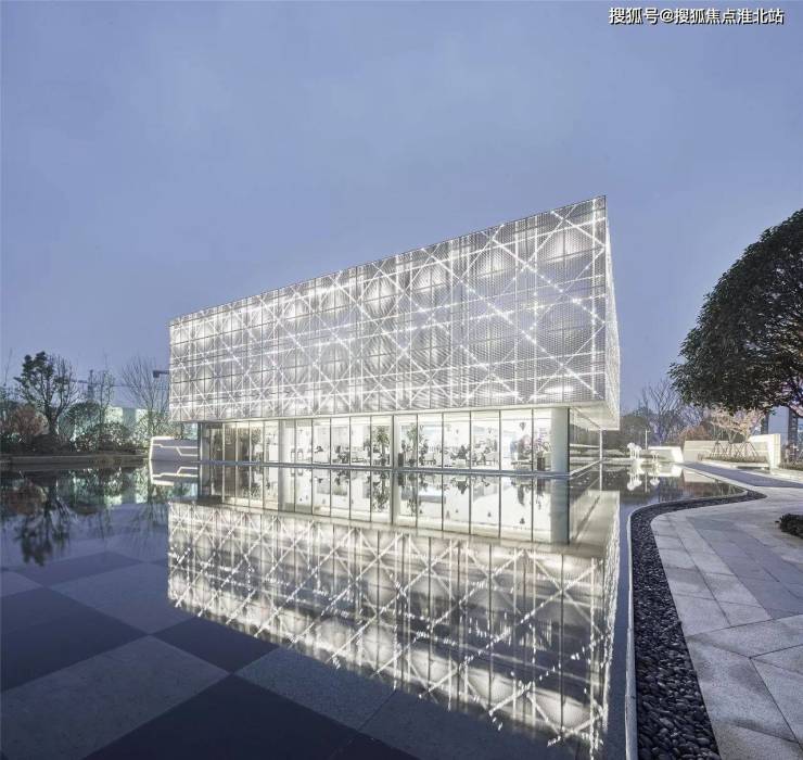 当灯光亮起,售楼部成为夜幕里的最明亮的星辰画卷,又仿佛是一个精美的礼物盒子,等待着被人打开,收获惊喜。精致的编制纹理随着灯光的渐变,与水面的倒影一同协奏出黑夜的奏章,打造出奢侈品店般的大牌质感。