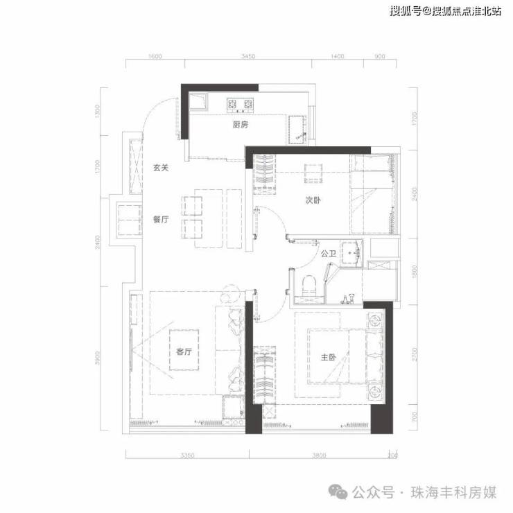 前沿S墙设计,预留冰箱位,空间零浪费;约3.8米面宽大主卧大飘窗。