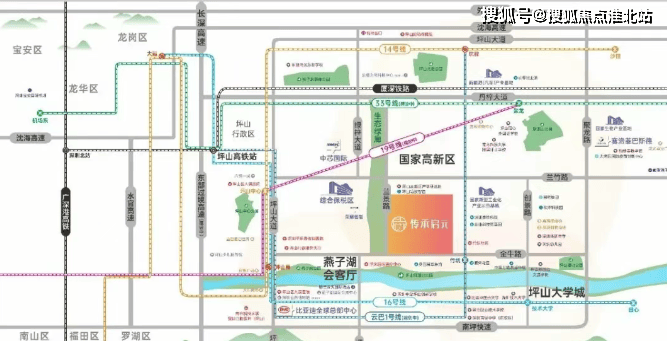 交通配套:地铁 16 号线技术大学站已开通运营,距离项目约 1.5 公里,可快速换乘 14 号线直达福田中心区;19 号线(规划中)南塘围至聚龙,站点距离项目较近;33 号线深惠城际(在建)聚龙站至宝安机场;坪山高铁站升级扩建打造综合枢纽,未来汇聚 8 条轨道;还有南坪快速、东部过境高速、外环高速、坪盐通道、沈海高速、水官高速等快速路网。