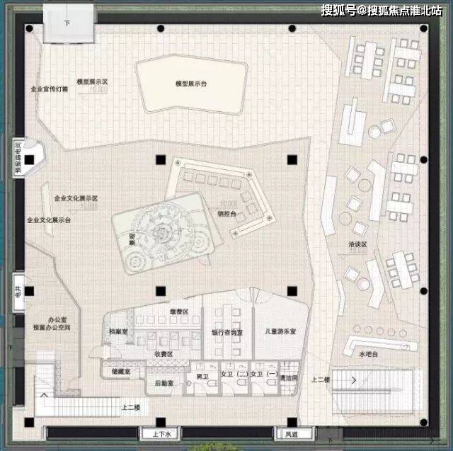 首层为600多平方,且在一层空间内完成了整个入口-模型企业文化展示-接待-开放洽谈-签约-财务-样板体验流线,二层设两个室内样板房。