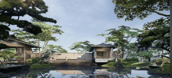 采用中式园林风格,以魏晋风骨、两宋文蕴为底蕴,打造两进山水园林。一进山水院,以叠石奇景、精巧花木为主,营造如居山中的归家体验;二进镜水院,以水景、曲桥、角亭为主,呈现中式园林空间,还通过环绕式连廊、点景亭台、曲桥竹径将山水园境串联。