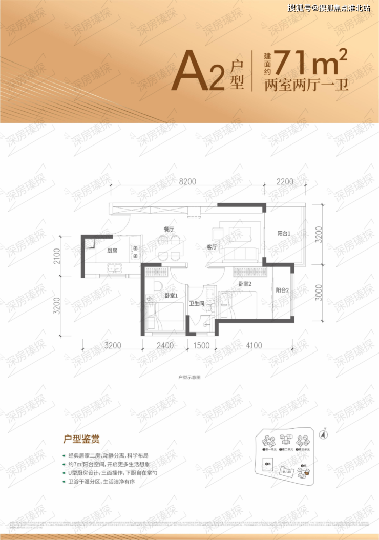 71㎡的2房2厅1卫,设计的是竖厅格局,客厅3.2米开间,进深8.2米,LDKB一体化设计,2个卧室分别做到了主卧12.5㎡/次卧9.12㎡(包含墙体飘窗),U型厨房,卫生间干湿分离,得房率约88%(包含赠送),东南朝向.