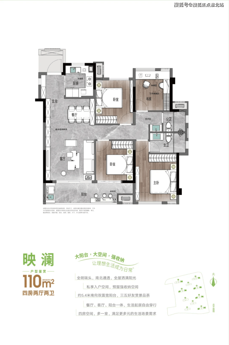 约110㎡的大四房户型,则采用了内外双玄关空间设计,配备6.8米超大宽幕阳台和落地玻璃窗,确保室内采光充足,视野通透。而约130㎡的四房户型,则特别考虑了高阶客群的居住私密感,采用了双主卧套房设计,得房率高达94%,并配置了独立家政空间,让居家功能更加完善。