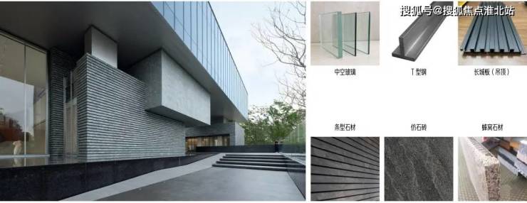 建筑整体采用纯幕墙体系,石材+铝板+玻璃+不锈钢在外墙材质中占比超过百分之九十,整个外立面基本为玻璃+石材的组合,采用创新石材节点体现层叠肌理感,局部银灰雾面不锈钢内框收边,以精装手法处理外立面。
