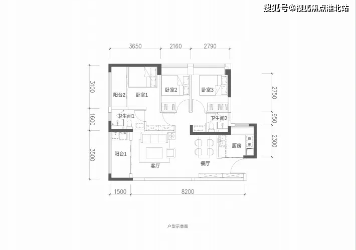 86㎡的3房2厅2卫,设计的是竖厅格局,客厅3.5米开间,进深8.2米,三开间朝南,3个卧室分别做到了主卧13.59㎡/次卧7.95㎡/次卧6.06㎡(实测面积,去掉墙体飘窗),得房率约88.08%(包含赠送),东南或西南朝向。
