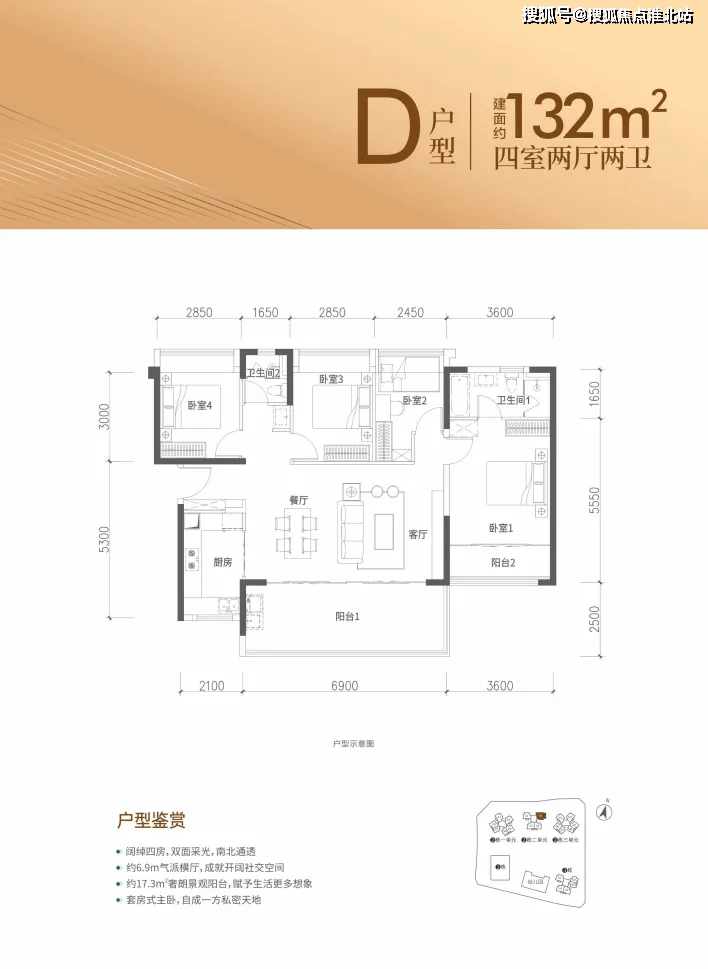 132㎡的4房2厅2卫,设计的是横厅南北通透格局,客餐厅6.9米开间,四开间朝南,4个卧室分别做到了主卧19.98㎡/次卧10.26㎡/次卧10.26㎡/次卧8.82㎡(包含墙体飘窗),得房率约90.2%(包含赠送),阳台主朝正南向。
