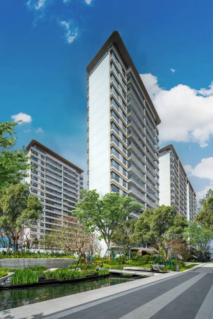 社区内部:户外泳池、全龄架空层活动区、热带度假园林、酒店式入户大堂;Low-E 玻璃 + 香槟金线条外立面,耐海风腐蚀。