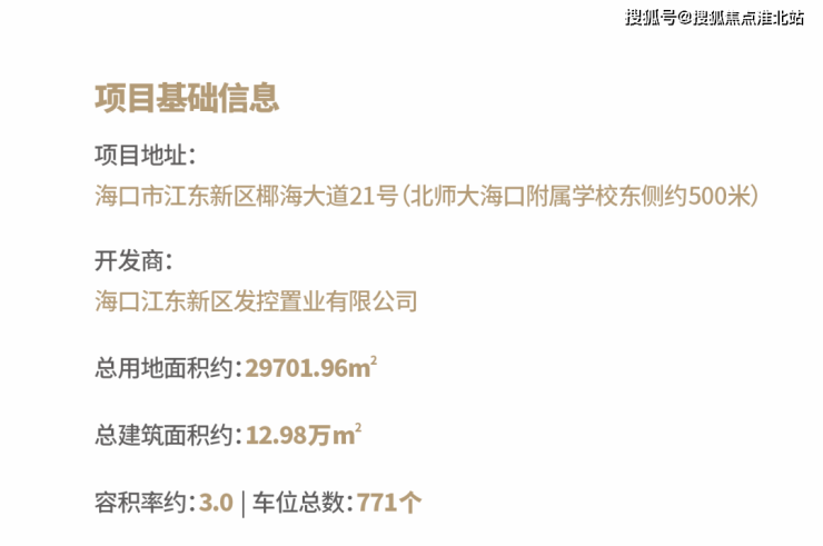 项目具体位于海口市江东新区椰海大道21号(北师大海口附属学校东侧约500米),总占地面积约29701.96㎡,总建筑面积约12.98万㎡,容积率约3.0,而车位总数有771个。