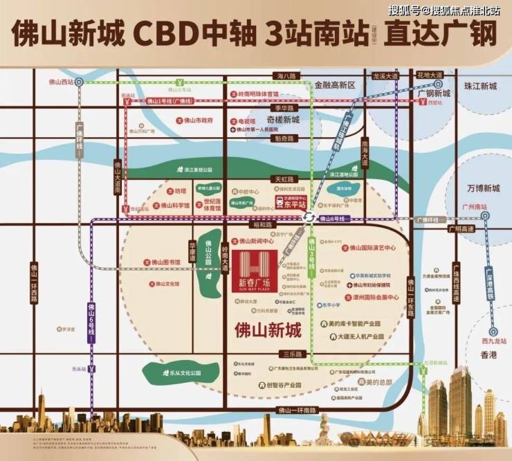 目前,佛山新城内投入使用的地铁站已经超过了3个,涵盖广佛线、3号线、6号线以及5号线,均可1小时内直达广州城芯,中途不用换乘。