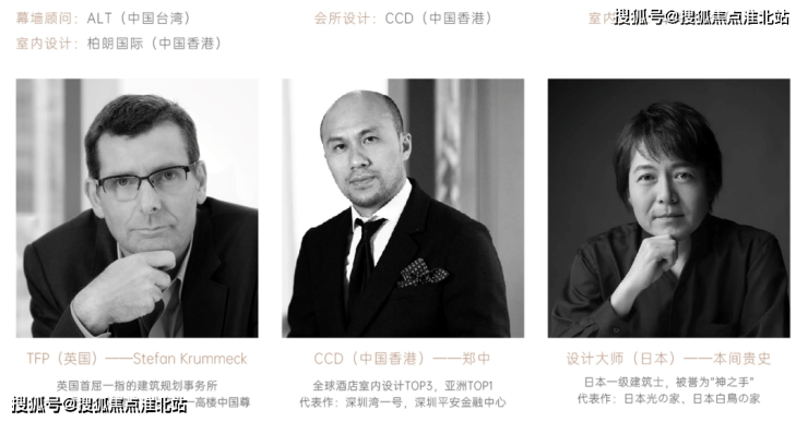 英国首屈一指的建筑规划事务所 TFP; 打造了 深圳湾1号、深圳平安金融中心的 国际大师郑中; 日本一级建筑士、被誉为神之手的设计大师 本间贵史……