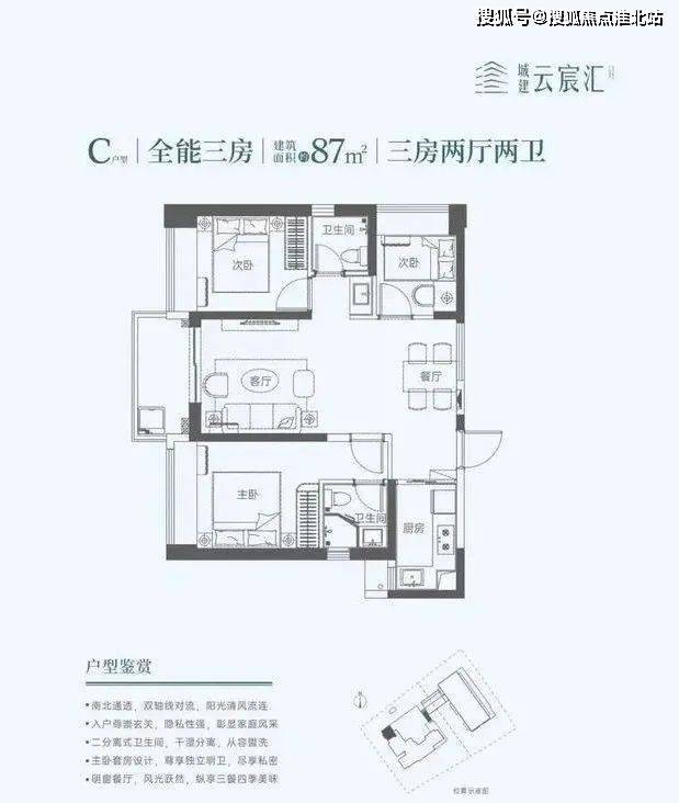 87㎡的3房2厅2卫,设计的双龙抱珠格局,餐客厅一体化,L型厨房,东南朝向。
