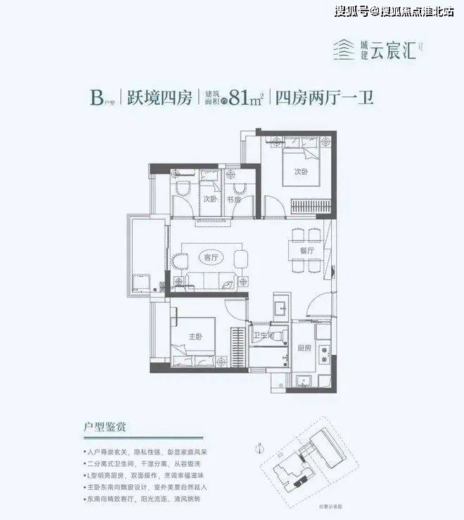 81㎡的4房2厅1卫,设计的双龙抱珠格局,餐客厅一体化,L型厨房,东南朝向,这个面积段能做到4房现在的市面上非常难得。