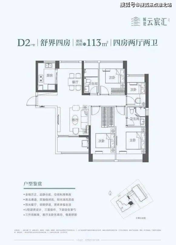 113㎡的4房2厅2卫,设计的竖厅南北通透格局,餐客厅一体化,U型厨房,阳台东南朝向。