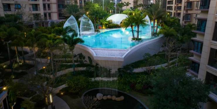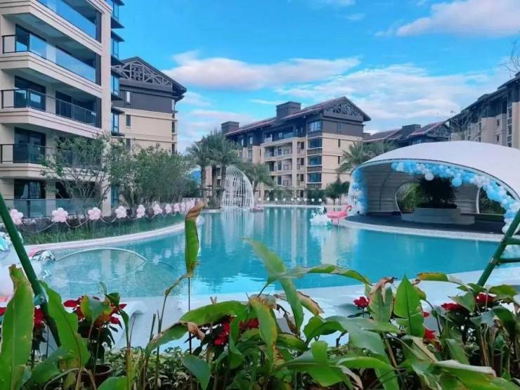 设计亮点:依山势错落布局,避免视野遮挡;园林融合五大雨林园区、热带植物;阳台温泉泡池 + 观景台一体化;全屋精装,品牌厨卫,中央空调,部分户型带飘窗;架空层设置九大主题乐活场景,适配老人小孩。