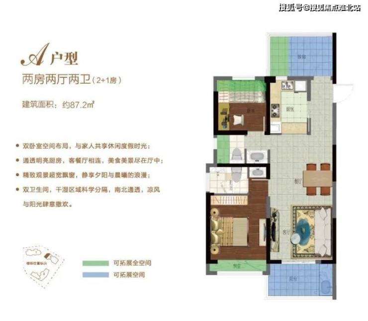 B户型:85.36㎡两房两厅两卫