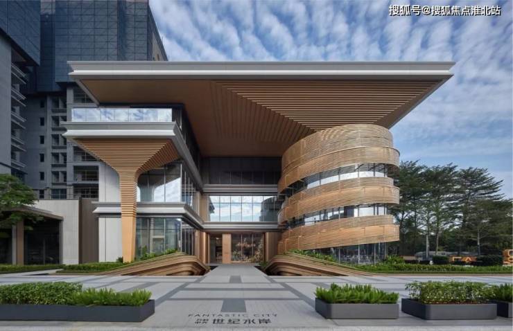 建筑造型提取传统村落的榕树意向,打造东莞首个大型树形标识建筑,形成“树下“灰空间+广场,方便市民开展多种社交活动增加城市活力,建筑造型“树”与基地旁边公园的树木相互映衬,结合错落有致的立体绿化,成为未来龙湾都市公园生活场。