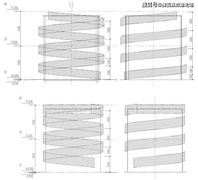 盘龙芯半径4.6米,以圆心等分20份,每段弧长1450MM。为保证圆形曲线顺滑玻璃采用弧形玻璃。外侧盘龙分内外两层,内层距玻璃400MM外层距玻璃800MM。为便于现场施工,外侧盘龙毎圈高度方向爬升3米,保证曲线相同。