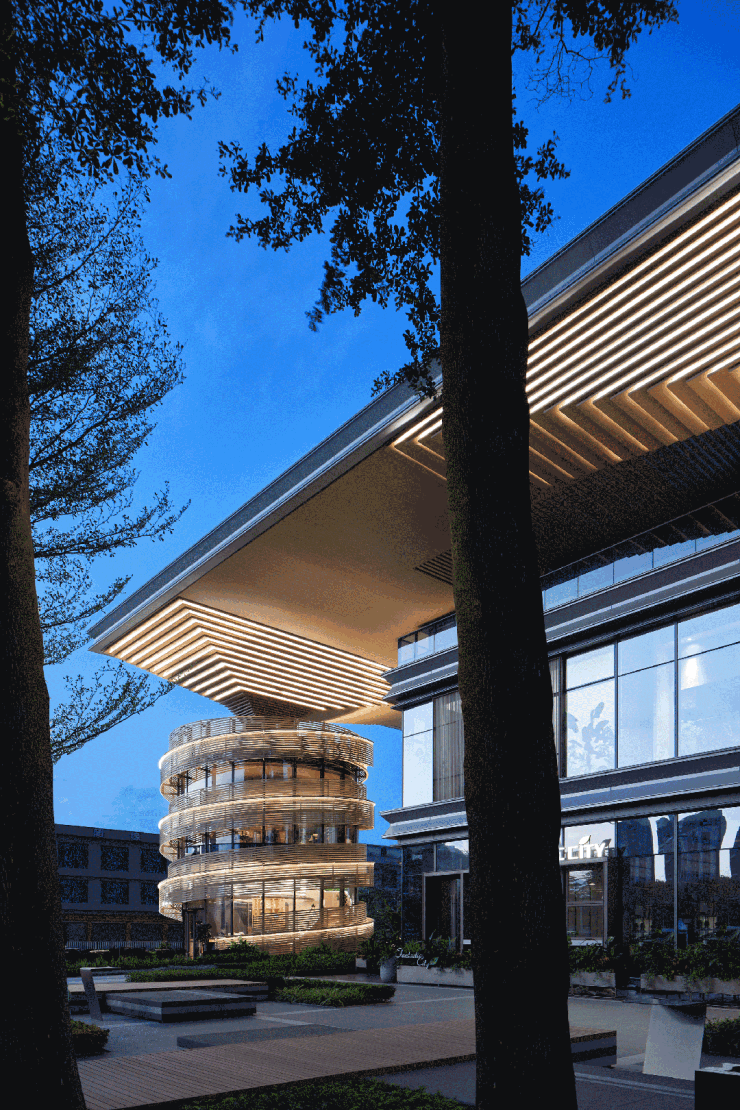建筑入口处标志性体量,建筑语言演绎东莞舞龙文化。融合在地性文化,打造东莞首个螺旋造型精品店,树立片区IP品牌,网红打卡地