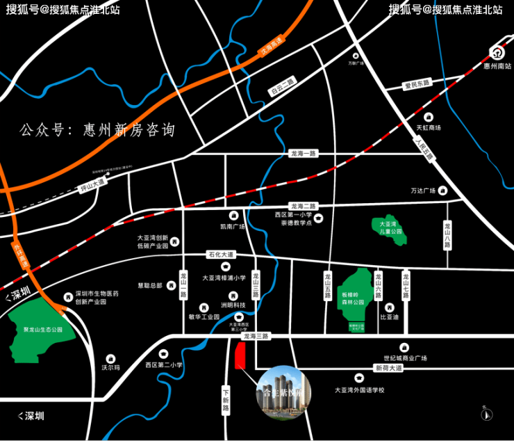 而距离深圳约2公里的合生紫悦府,距离深圳地铁14号线沙田站(建设中)、16号线田心站(建设中)仅约15分钟车程,项目约2公里内还规划有深大城际聚龙站,门口龙海三路连接南坪快速(三期)直通深圳,坐享多维交通,合生紫悦府未来可期。