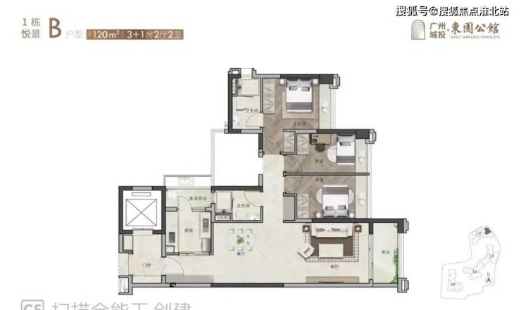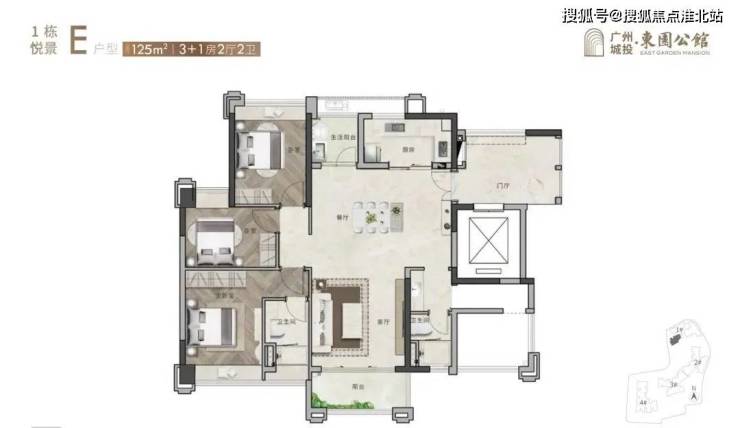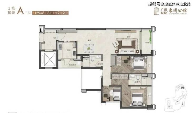 120平3+1房和125平3+1房AB两个户型:分东北、东南、西南向,其中125平竖厅户型为南北对流。