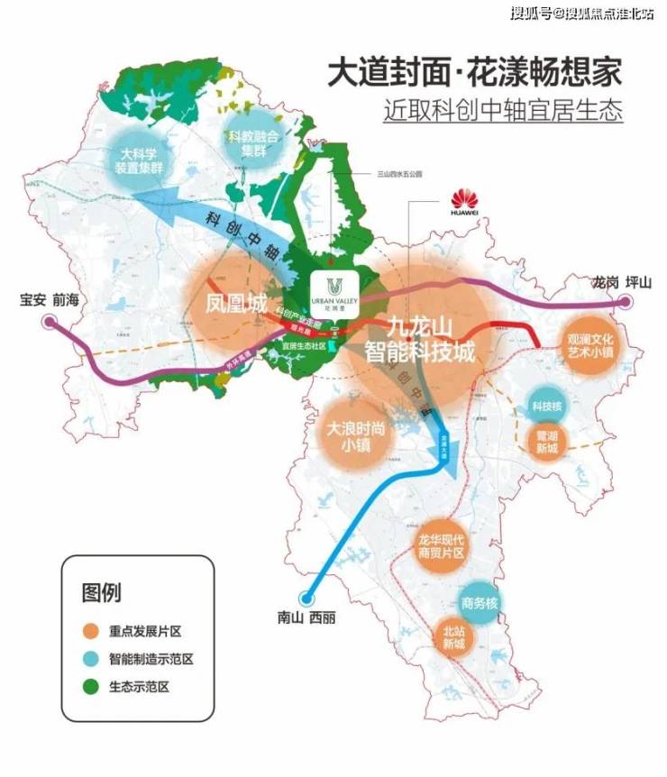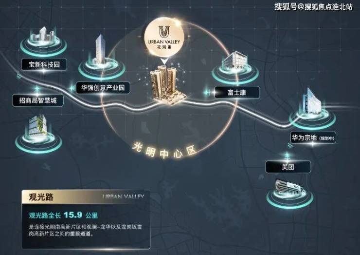 观光路,作为连通光明、观澜、大浪的核心主干道,沿途布局华强创意产业园、华润苹果小镇及富士康、华为、美团等具有世界级影响力企业,承载上下游产业智能化高端化发展红利,成就区域价值高地,未来堪称深圳北部深南大道;
