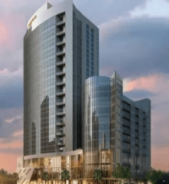 建筑规划:由 1 栋总层高为 10 层的酒店和 1 栋总层高为 17 层的商务中心组成,商务中心为 4 梯 9 户共 126 户,车位数有 309 个,交付时间为 2021 年 10 月 31 日,交付标准为硬装入户。