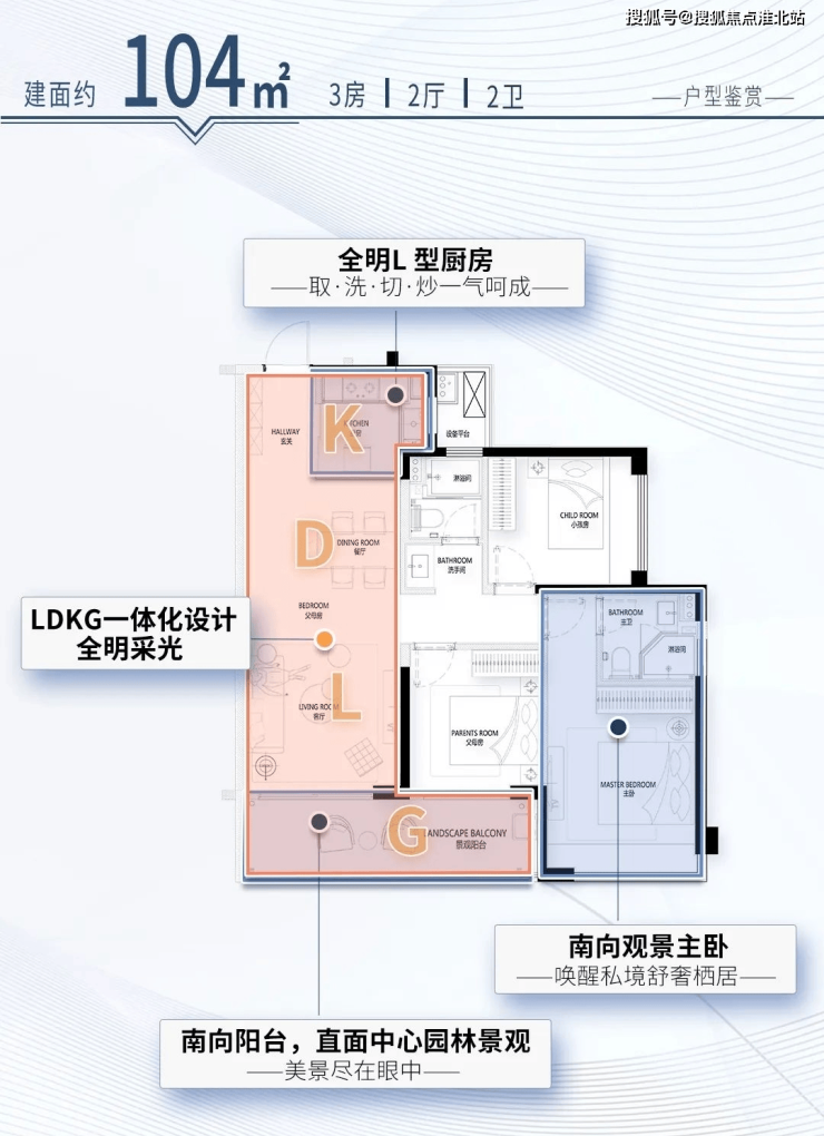 比如104㎡三室两厅两卫,经典的LDKG一体化布局,南向主阳台面宽6.6米,家中即可直面欣赏中心园林景观。