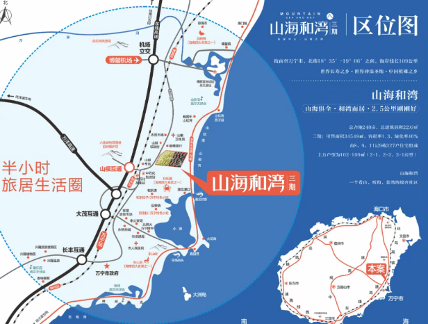 地理位置优势:居博鳌与万宁 “中央”,距环岛高速出入口 2 公里、和乐动车站 5 公里,G98 高速通达四方,共享博鳌及省会城市医疗等优质城市配套。项目近海但不靠海,不受台风和湿气影响,气候适宜,是养生度假的好地方。