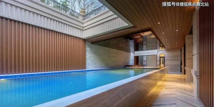 并且地下室层高约4.5米,总面积450㎡,三连厅设计,庭院处可以装得下一个13米长的游泳池,很有巨邸豪宅的气场。