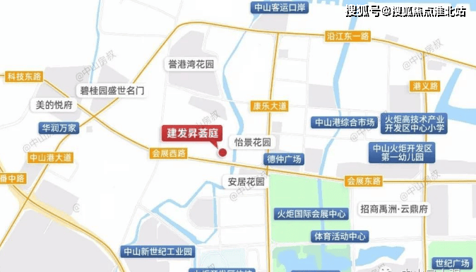 建发昇荟庭位于会展西路一侧,紧临康乐大道,与怡景花园相邻,与安居花园只有一路之隔。并且与中山客运码头直线距离不足一公里,离深中通道出口的仅需15分钟的车程,属于中山港片区。