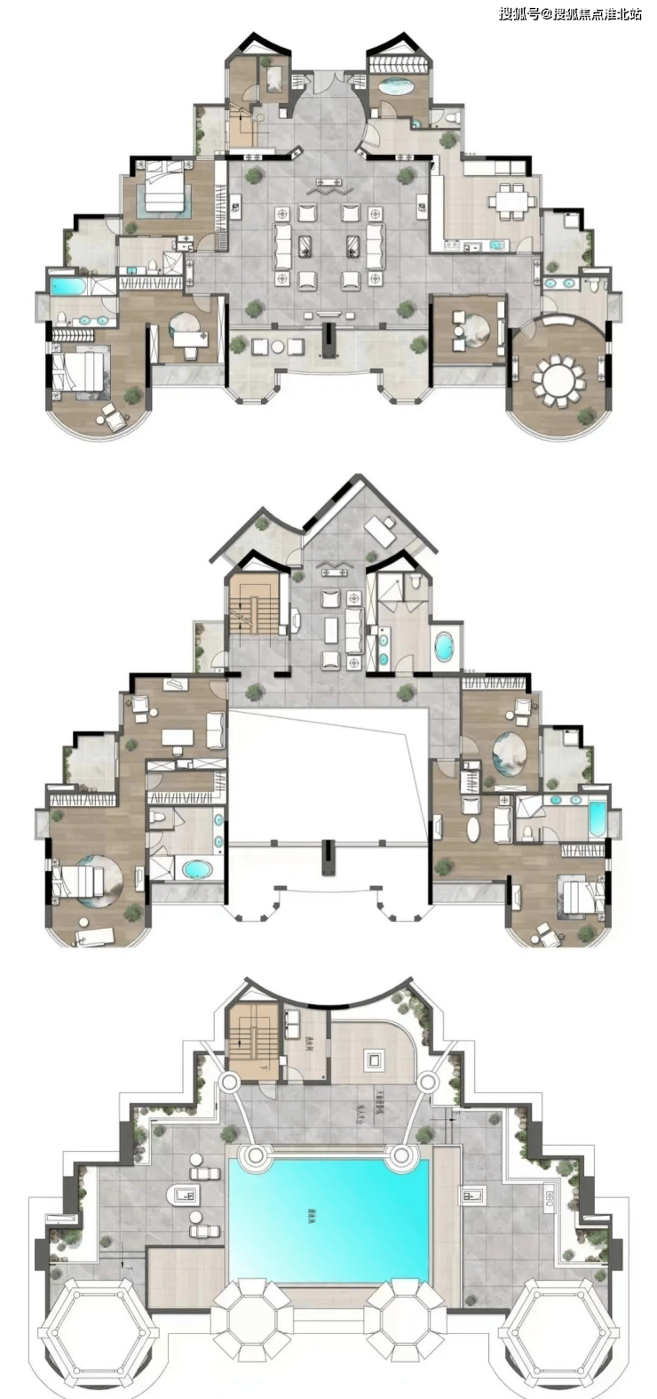 再细看,约458平、467平、564平顶复户型图参考如下,为双层结构,且赠送多一层露天泳池花园,相当于有3层使用空间。