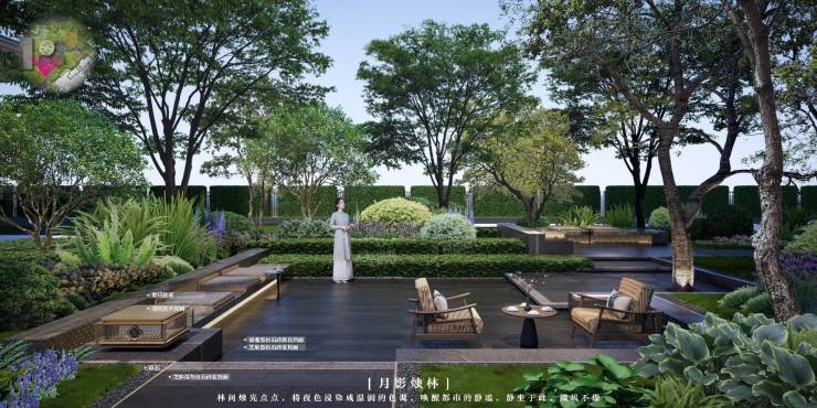 园区入口、中心园林区结合叠水种植罗汉松、油松等名贵树种,有长寿、守财、吉祥之意