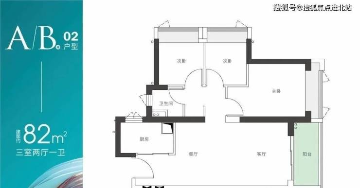 A/B座02户型-建面约82m² 三房两厅一卫