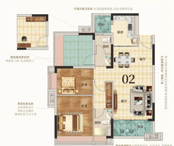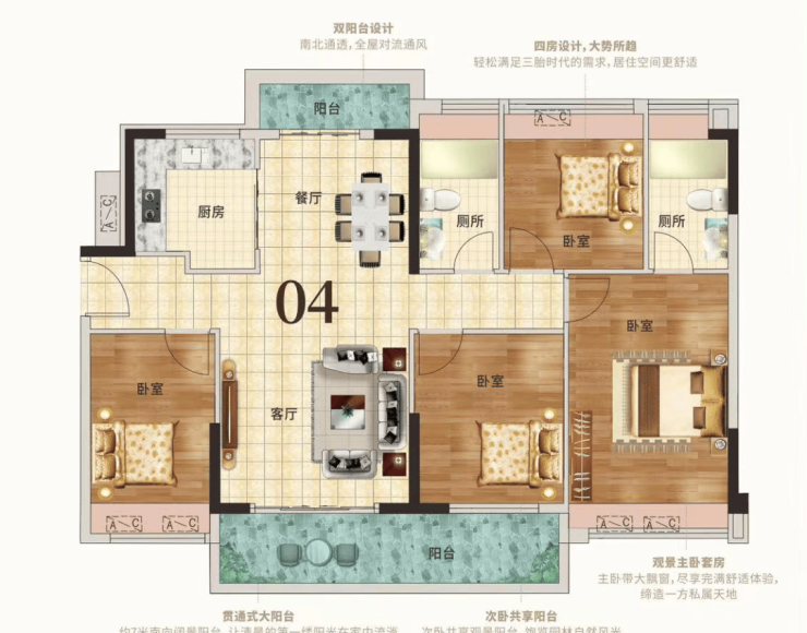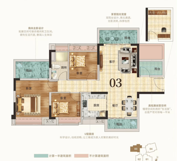 再来看看03户型,约102m²3+1房2厅1卫,与01户型不同的是,该户型实用率能到达97%,且为双阳台设计,四开间朝东南,通风、采光性更加好。
