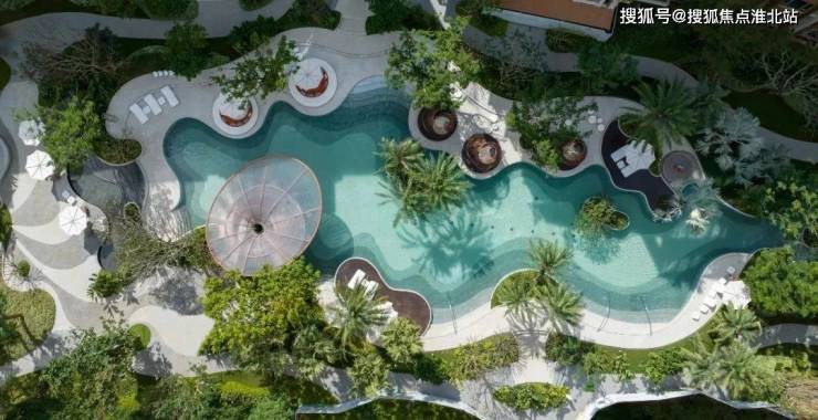 景观以强烈的地域符号,流动的设计手法展现了热带花园的自然感,以整体概念“漂浮的绿洲”引水入城,营造热带花园社区。