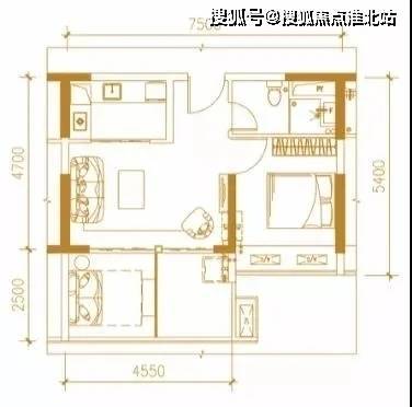 44平为1房2厅1卫,为横厅设计,格局方正,动静分区,进深为7.2米。