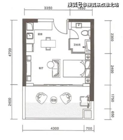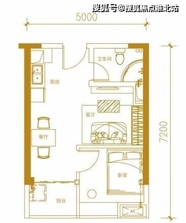 38平为1房1厅1卫,从户型可以看到,该户型的客厅与卧室一体化,开间为5米。