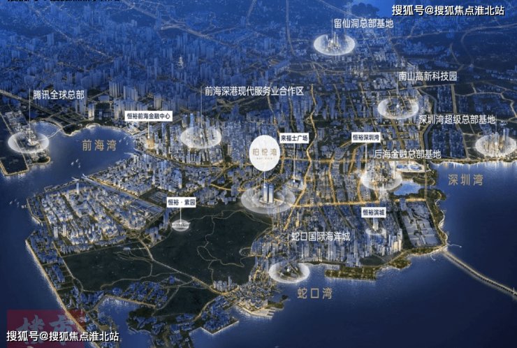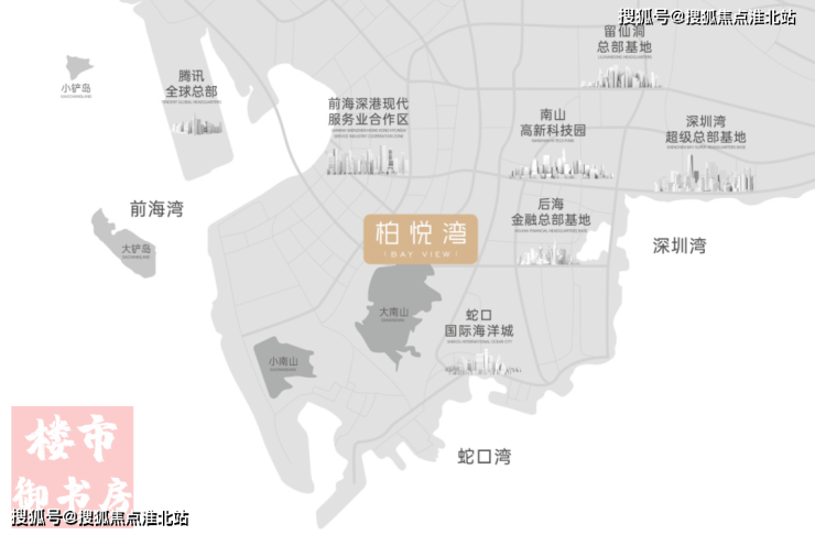 柏悦湾除三湾环抱之外,周边还有 七大总部基地环绕,这七大总部基地的名字,每一个都如雷贯耳—— 后海、前海、蛇口、深超总、科技园、腾讯岛、留仙洞。